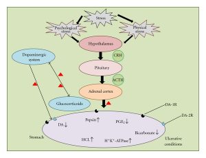 Khi căng thẳng kéo dài, dạ dày có thể tăng tiết axit, giảm lượng máu đến niêm mạc và làm tổn thương lớp bảo vệ dạ dày, dẫn đến loét dạ dày. Căng thẳng kéo dài làm tăng hormone cortisol và catecholamine, dẫn đến tăng tiết axit HCl và pepsin, giảm lượng máu đến niêm mạc, làm giảm chất nhầy bảo vệ và gây tổn thương mô.