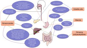 • Hạ đường huyết: Nhóm saponin protopanaxadiol (Rb1, Rb2, Rg3, compound K…) và protopanaxatriol (Re, Rg1, Rg2…) kích hoạt AMPK, tăng tiết insulin từ tế bào β và tăng GLUT-4, cải thiện khả năng hấp thu glucose.